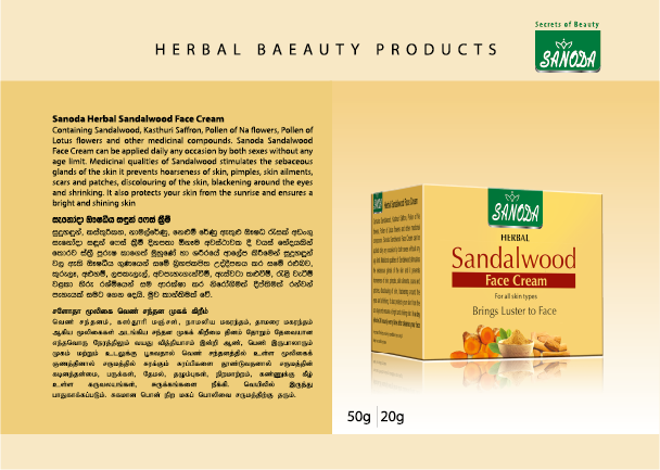 Containing Sandalwood, Kasthuri Saffron, Pollen of Na flowers, Pollen of Lotus flowers and other medicinal compounds. Sanoda Sandalwood Face Cream can be applied daily any occasion by both sexes without any age limit. Medicinal qualities of Sandalwood stimulates the sebaceous glands of the skin it prevents hoarseness of skin, pimples, skin ailments, scars and patches, discolouring of the skin, blackening around the eyes and shrinking. It also protects your skin from the sunrise and ensures a bright and shining skin